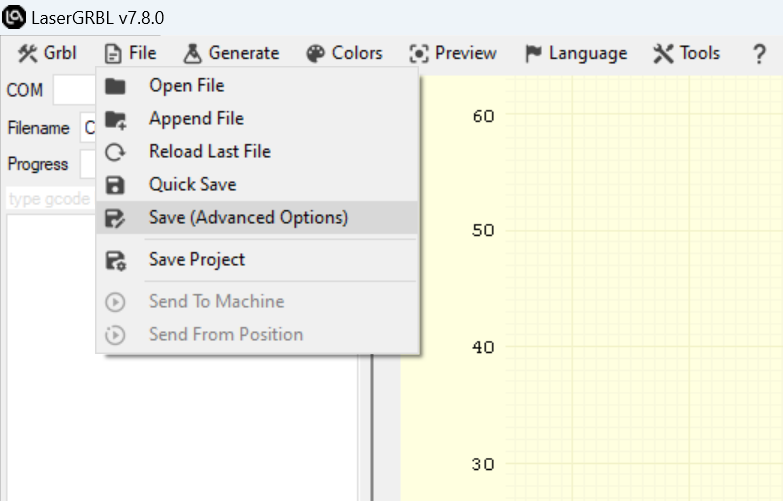 At this point, press File - Save (Advanced Option) to export the test file as Gcode, copy it to the microSD and start the Cutting Test on Longer Ray5 and Longer B1.
