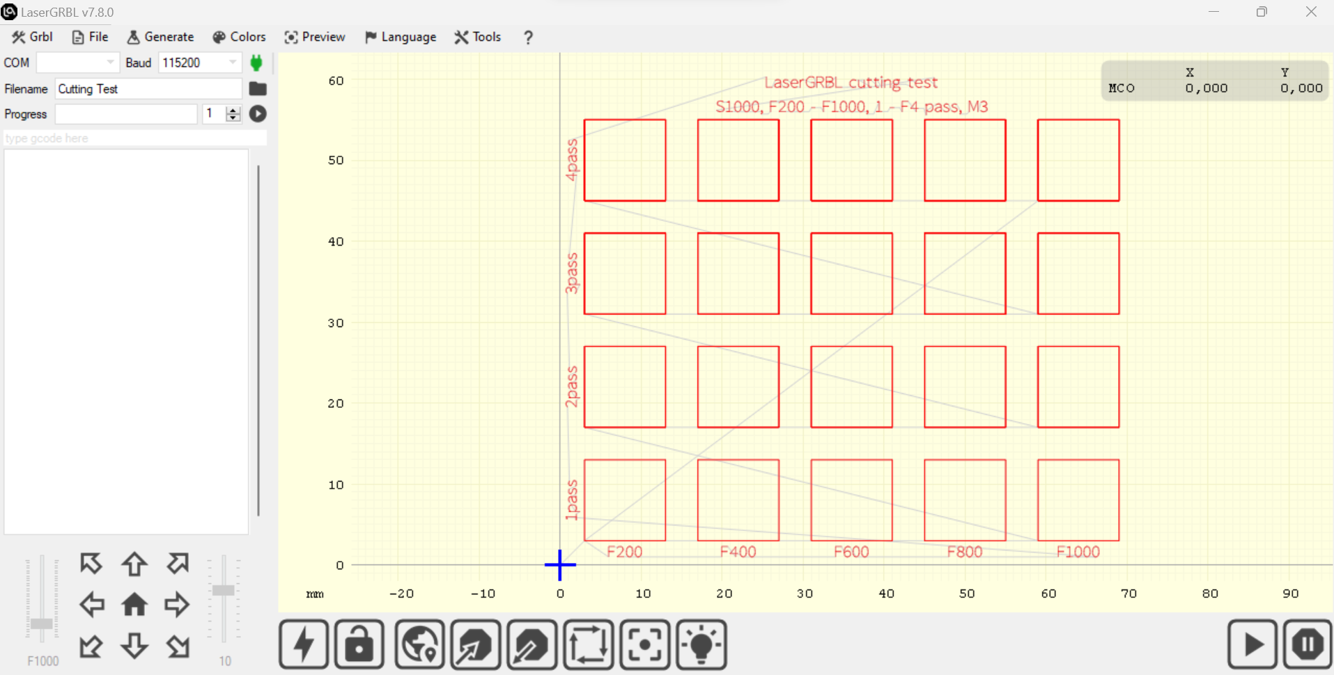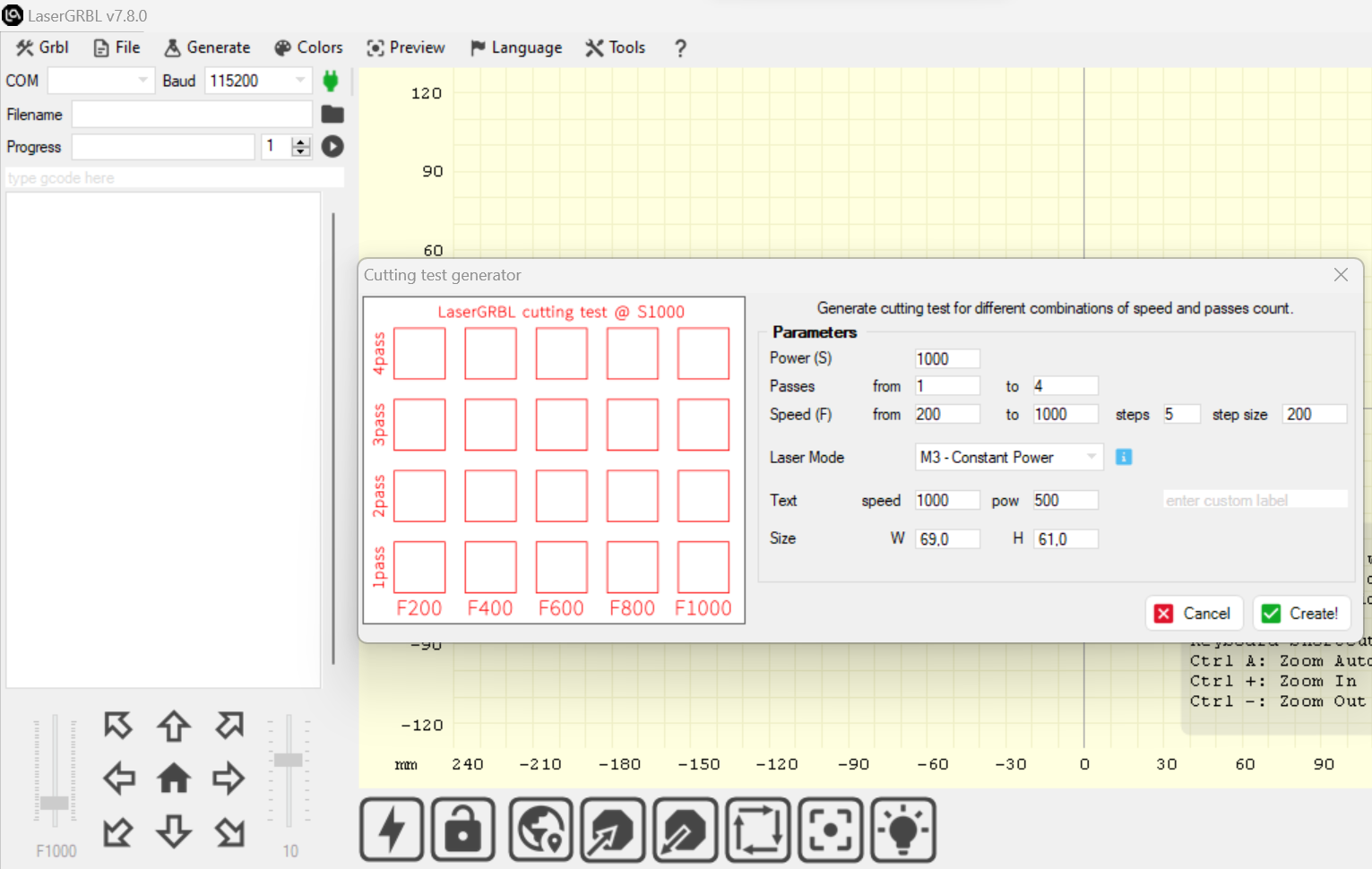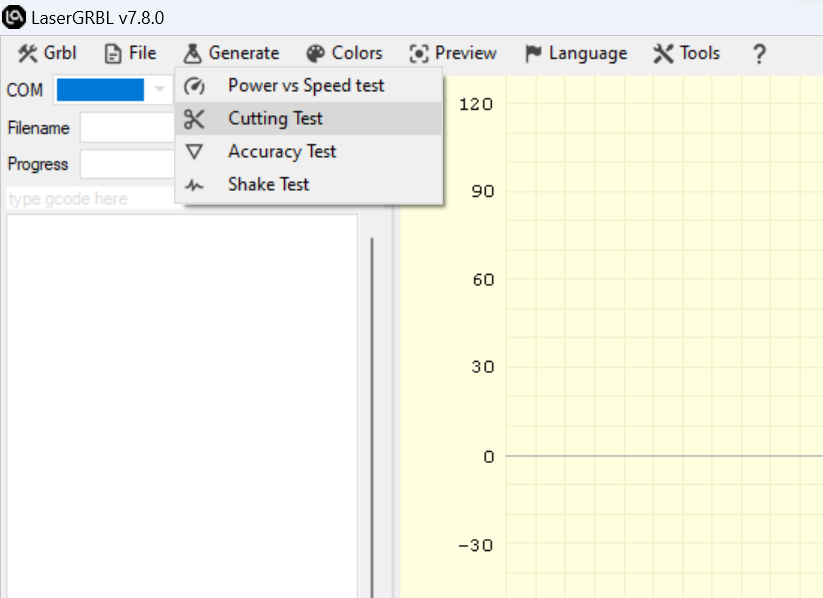 In order to obtain the correct parameters for the type of Basswood you intend to cut, LaserGRBL has a powerful Cutting Test tool, which allows you to quickly determine the most specific and correct parameters. From the LaserGRBL home screen, select Generate – Cutting Test: