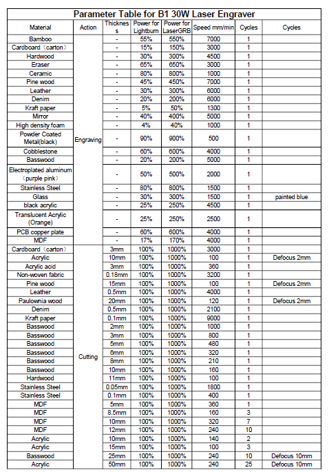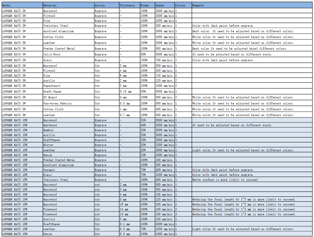 To have a reference, about what power and speed to adopt for each type of material, there is a fairly complete table accurately reporting the best parameters to use for Longer Ray5 5W and Longer B1.