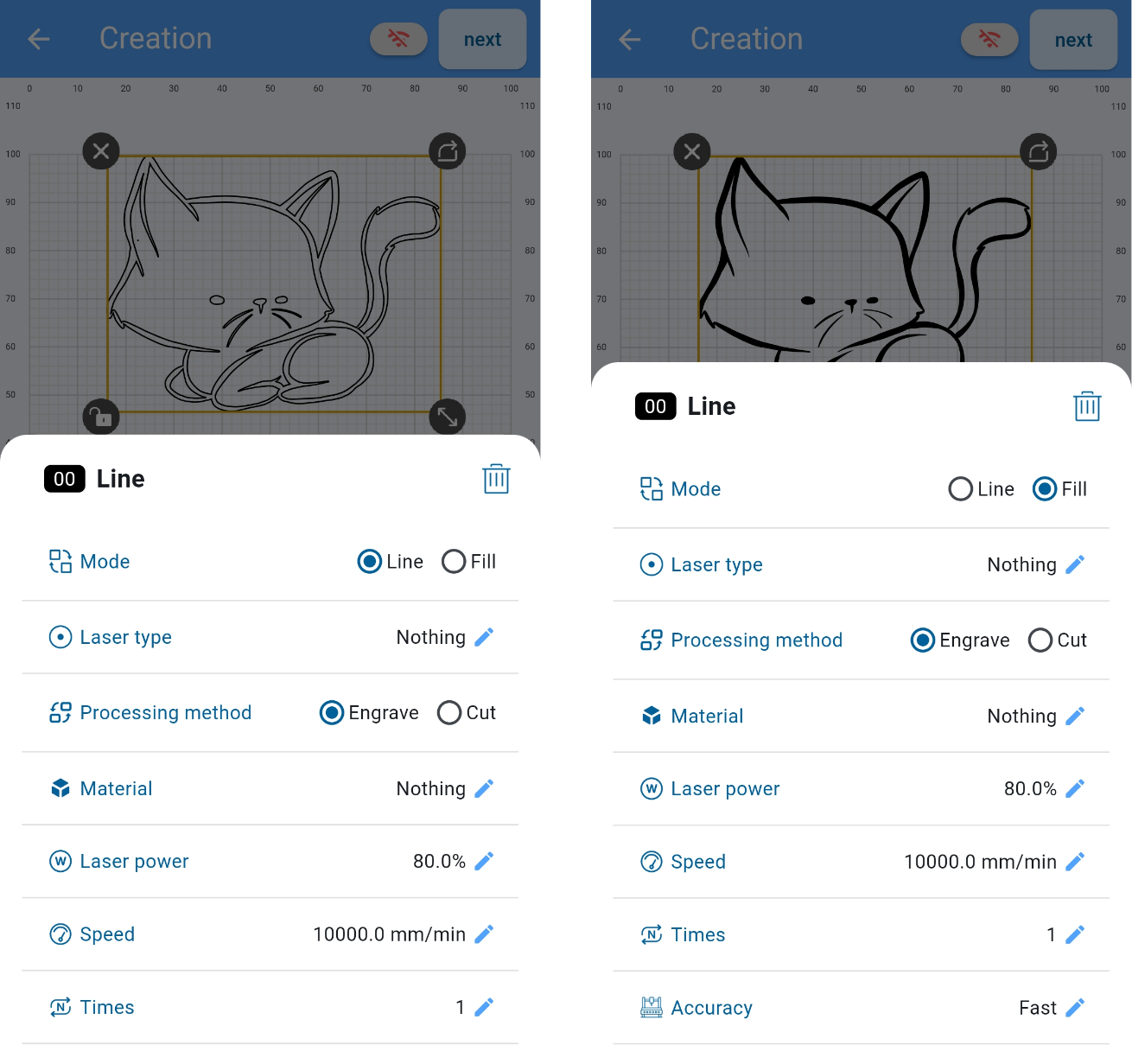 In addition, it is also possible to choose between two different Processing Method methods, namely Engrave or Cut; as mentioned, Engrave results in a series of lines engraved one after the other, until the image is completely realized, while Cut follows exactly the perimeter of the image. Therefore, it can be deduced that Cut is better suited to engrave vector images without fill, composed only of the perimeter, while Engrave is more suitable for engraving vector images for which it has been decided to add a fill as shown above.