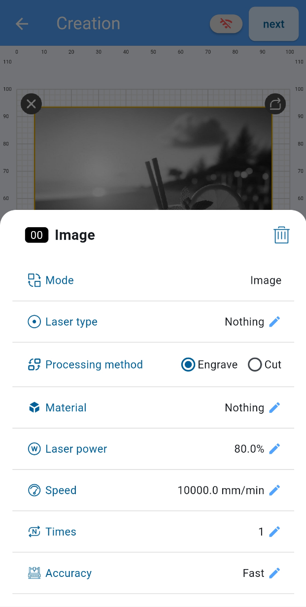Finally, in the Layers menu, you can set the engraving parameters. As far as graphic images are concerned, the ideal Processing Method is Engrave, which results in a series of lines engraved one after the other, until the image is completely realized. The number of lines per mm can be set via "Accuracy" according to your preference, keeping in mind that more lines to be engraved takes longer.