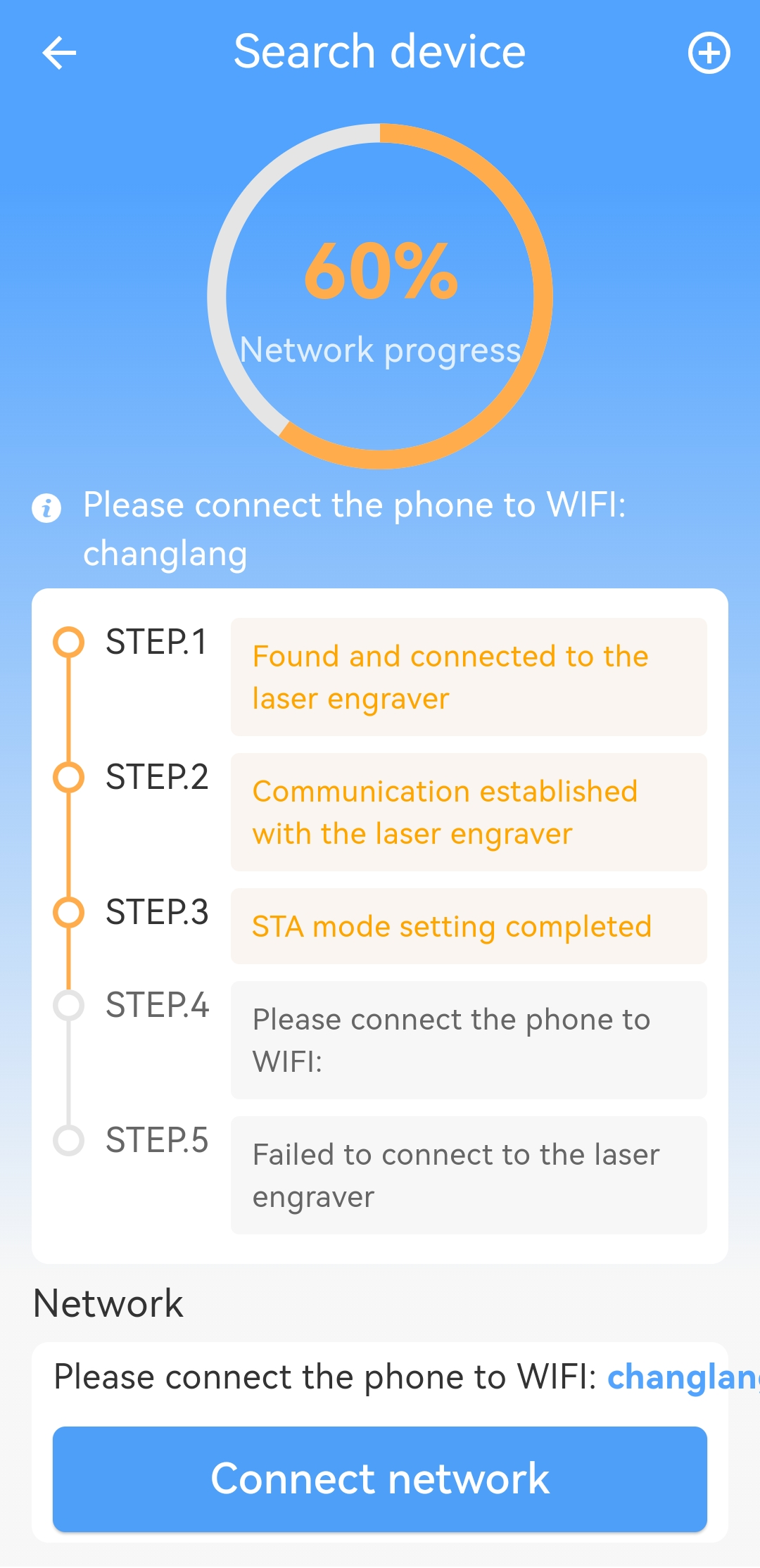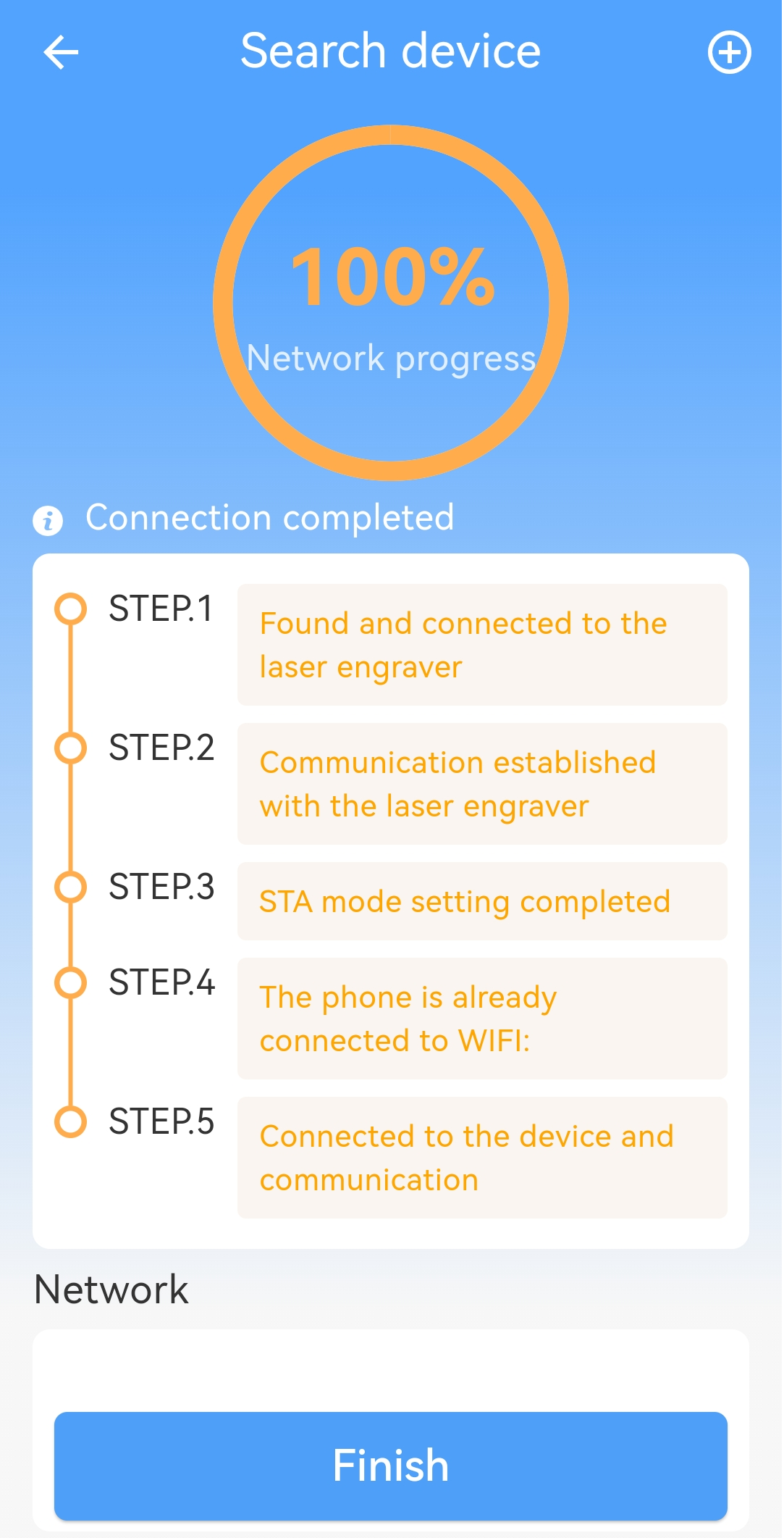 ● Return to LaserBurn, tap Connect network at the bottom, and ensure your phone is connected to the same Wi-Fi used in STA mode. Once it reaches 100%, tap FINISH to return to the device list.