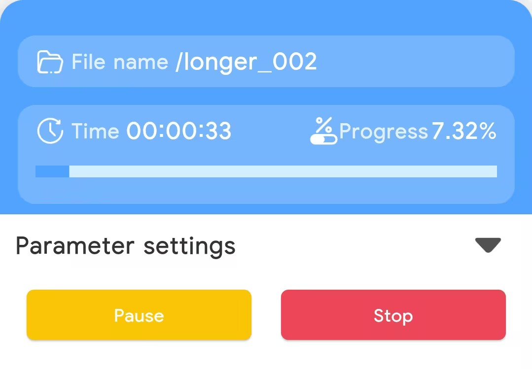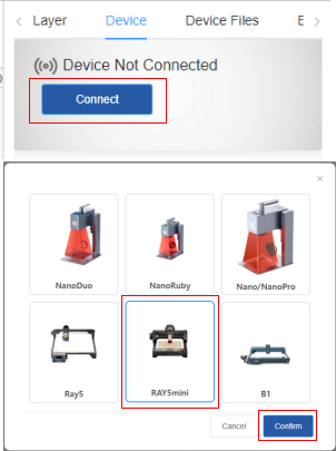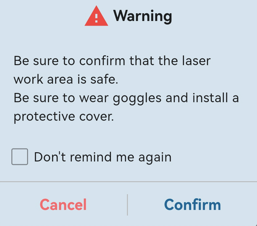 ● Once you’ve confirmed the focus is properly adjusted and goggles are worn, click Confirm to confirm the file name. The file will then upload to the RAY5 mini. After the upload is complete, click Confirm to start the engraving task.