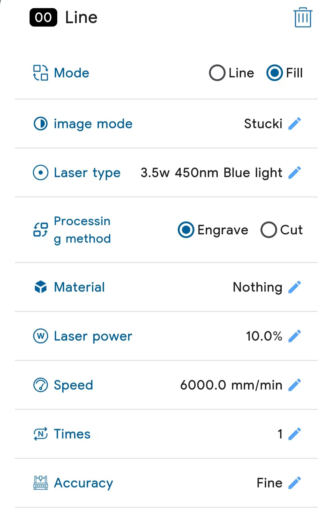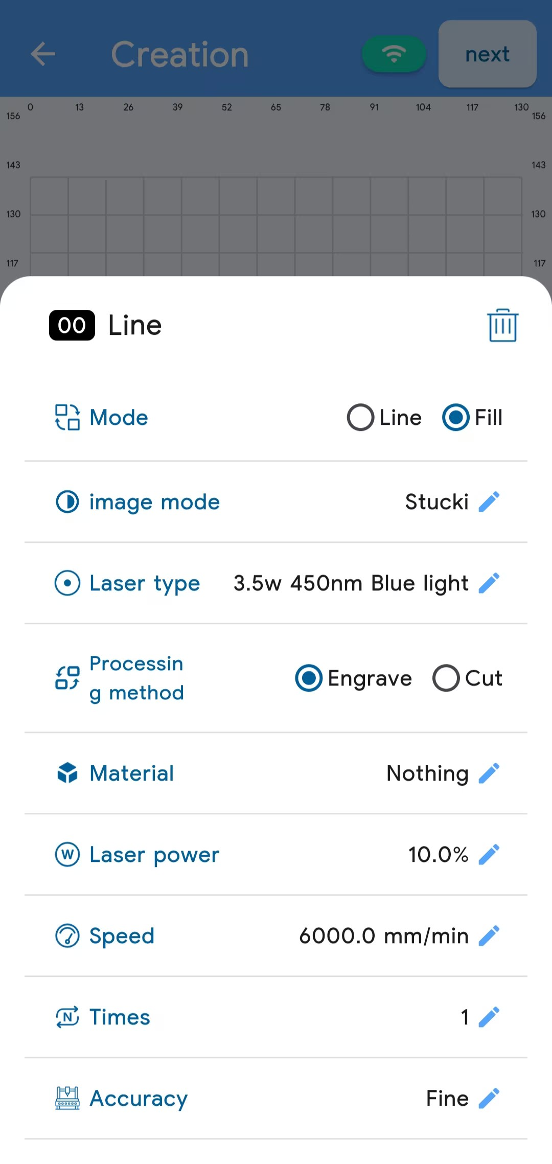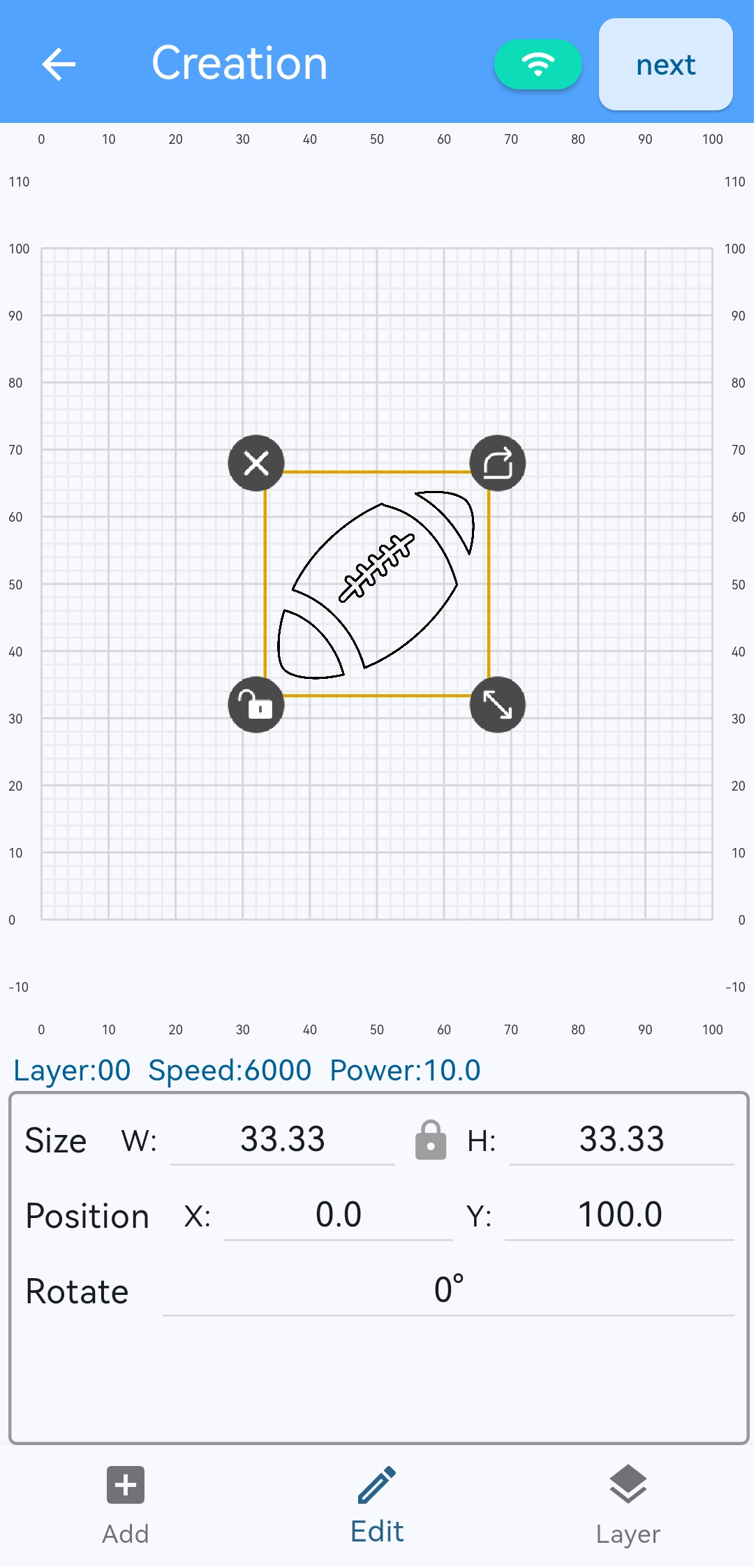 ● Run the LaserBurn app and connect it to the RAY5 mini. Add a graphic, click Edit to set the size and position, then click Layer to adjust the graphic parameters. After setting, click next in the upper right corner.