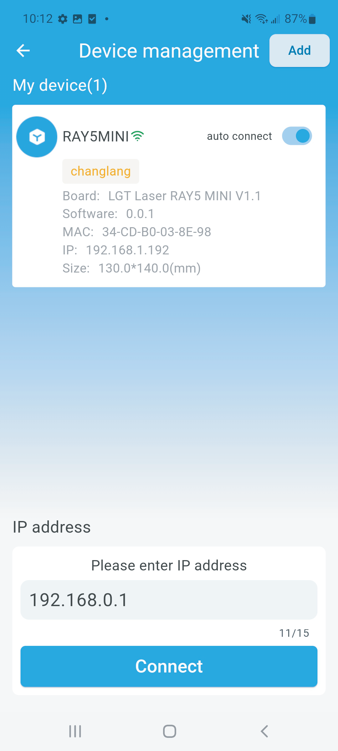 ● Open your phone’s Wi-Fi settings, find the network named LongerLaser_XXXX, and connect with the password 12345678. Then, enter 192.168.0.1 in the app, click Connect, and wait for the “connection succeeded” message.