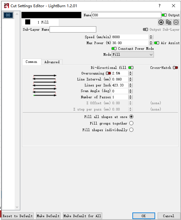 Enable Constant Power (note that different colors require different power settings, and these values are for reference).