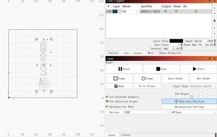First, run a test engraving. Select the design and click Switch to carving mode in the Console, then click Start in the Laser page to begin the test engraving. Ensure the parameters deliver the expected results. Once satisfied with the test results, proceed with batch engraving.