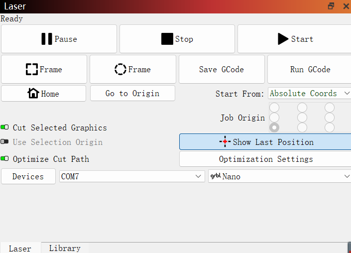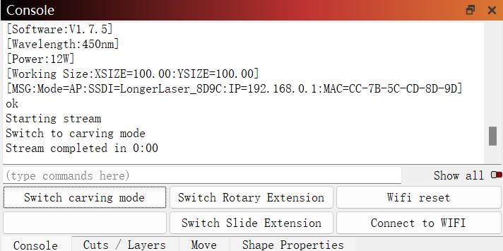 Connect the engraving machine to your computer using the Type-C data cable with the red connector, then power on the machine. Launch LightBurn or LaserGRBL software (this guide uses LightBurn as an example). Import the configuration file and select the correct serial port to connect the computer to the engraving machine (you can refer to the connection video provided on the YouTube channel). In the Console, click Switch carving mode to switch the machine to engraving mode.