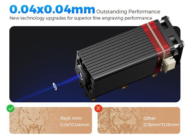 Don’t let the size fool you — the Ray5 Mini is equipped with a 32-bit motherboard and a powerful 2.5W or 3.5W laser module, achieving speeds up to 12,000mm/min — up to 20% faster than similar models on the market. The advanced compressed spot technology (0.04×0.04mm) delivers crisp, detailed engravings on wood, leather, acrylic, and more.