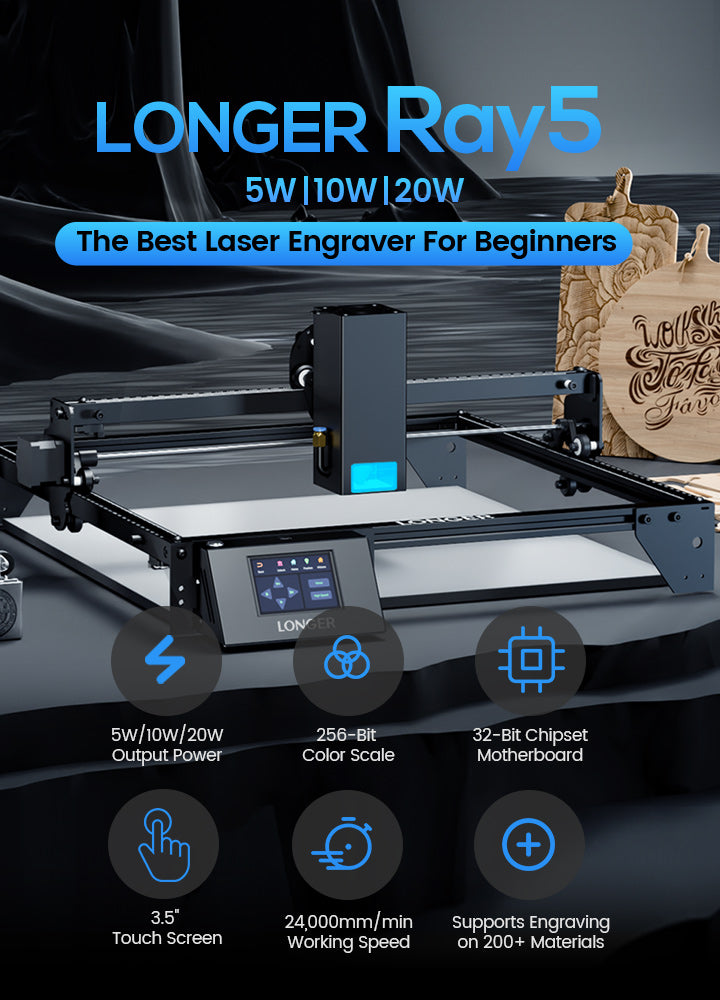 The RAY5 comes equipped with a 3.5-inch touch screen, offering seamless navigation and control. It supports three connection methods: USB, TF card, and WIFI offline mode. Additionally, the mobile app "MKSLaser," available for both Android and iOS devices, provides users with the convenience of controlling the Longer Ray5 directly from their smartphones. Beyond mere control, this app enables users to edit images and adjust engraving parameters on the go, ensuring flexibility and efficiency in their engraving tasks