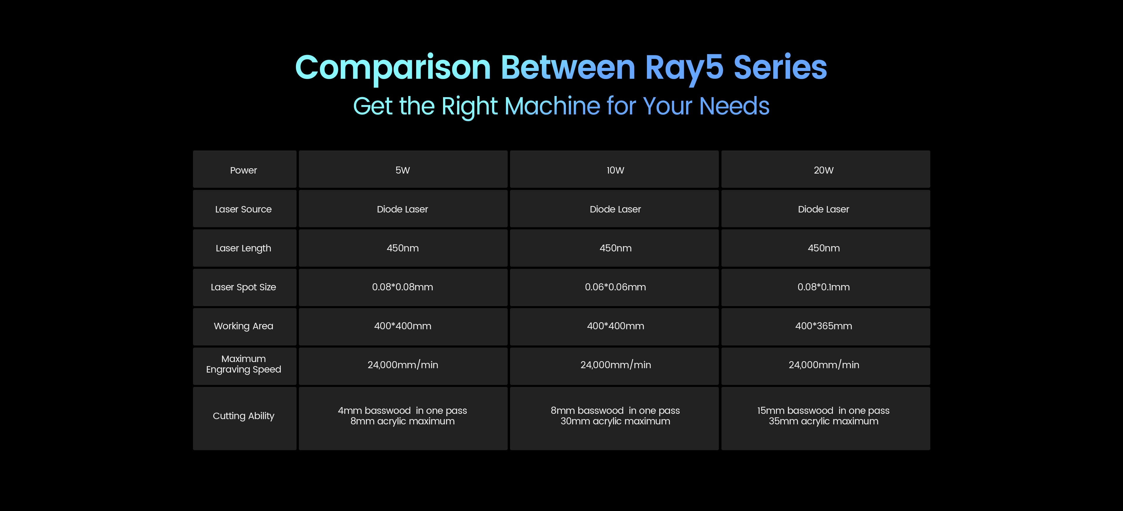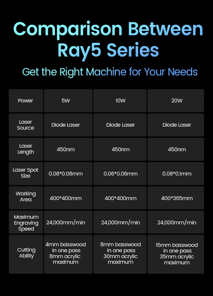 In addition to different power levels, the working area is also different. The area of RAY5 5W&10W is 400x400 mm (15.75x15.75 inches), and the area of RAY5 20W is 400 x 365 mm (15.7 x 14.4 inches). RAY5 20W offers more power, which means faster speeds, for experienced users looking for advanced engraving and cutting capabilities. If you pursue efficiency and have higher cutting requirements, please choose RAY5 20W; If you pursue fineness and engraving precision, then RAY 5W&10W fits you