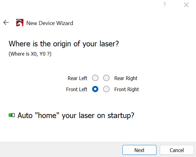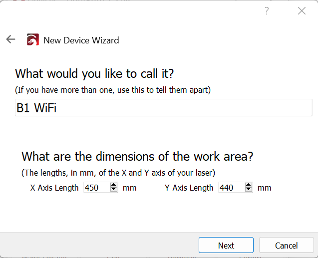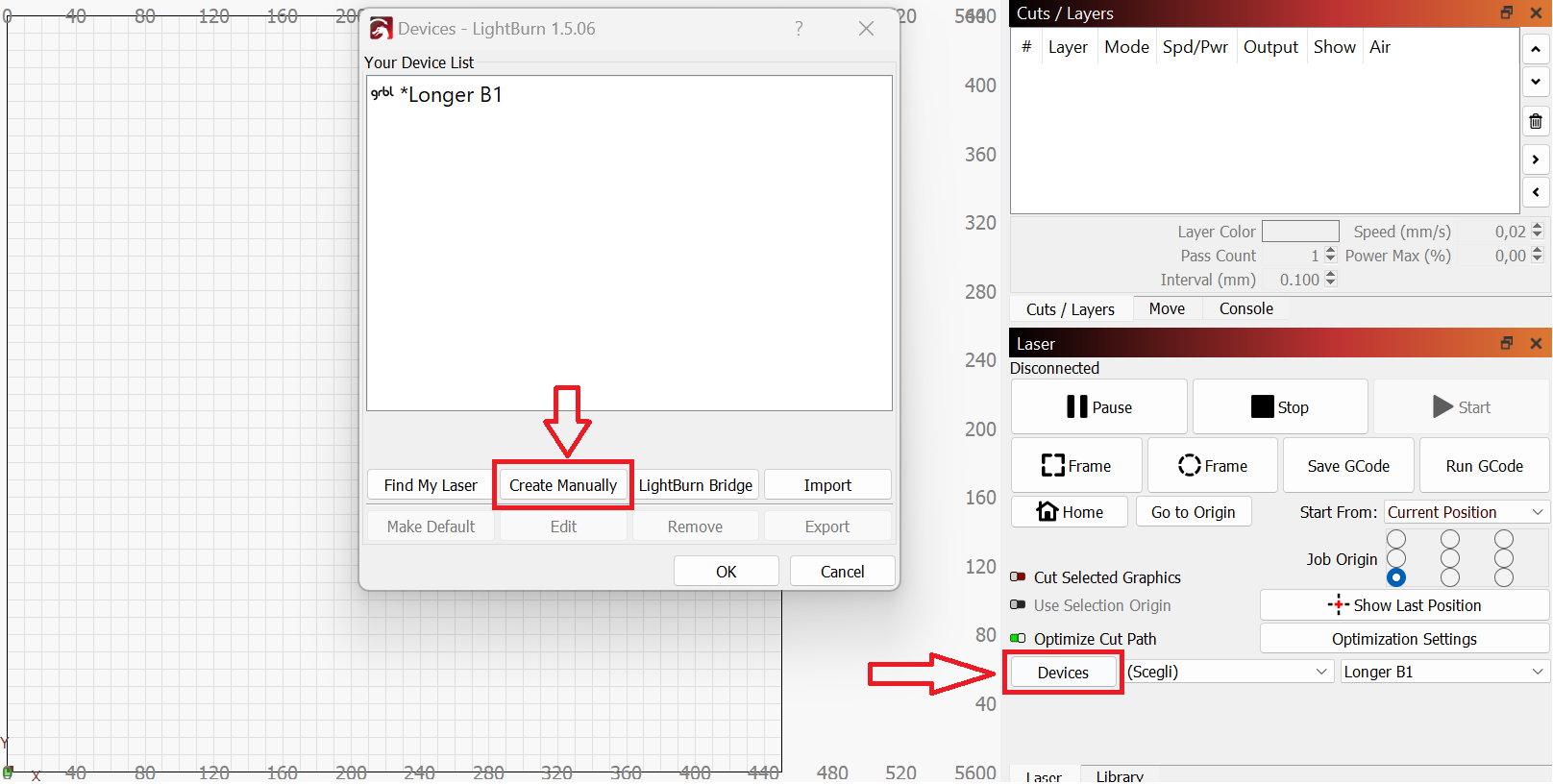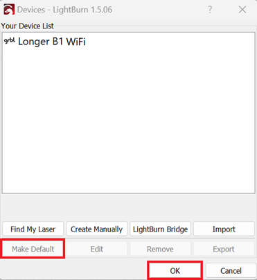 Once the Longer B1 has been successfully connected to the WiFi Router/AccessPoint and the IP address has been successfully provided and noted, proceed to open Lightburn on your Laptop. At this point, proceed as follows.