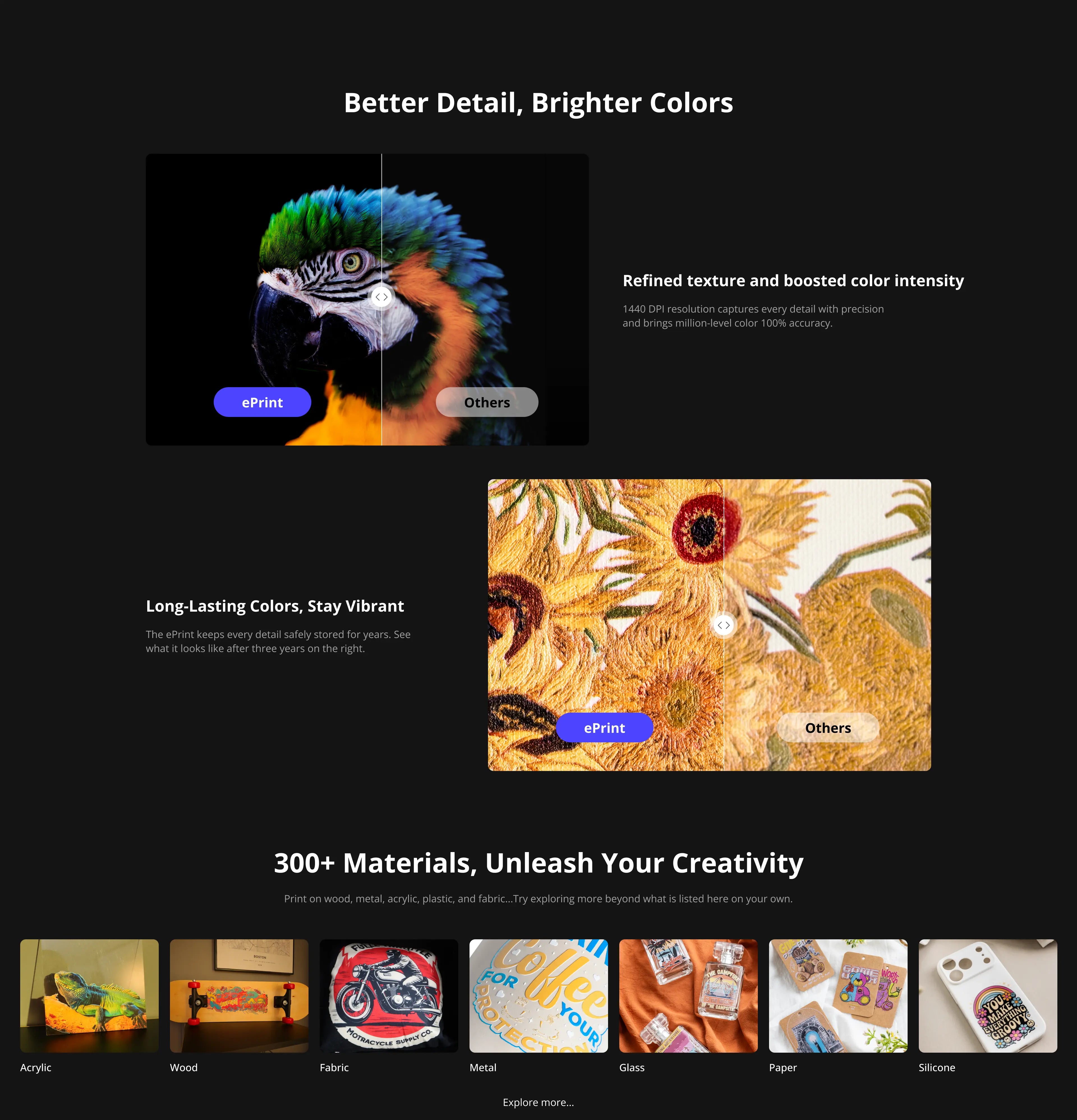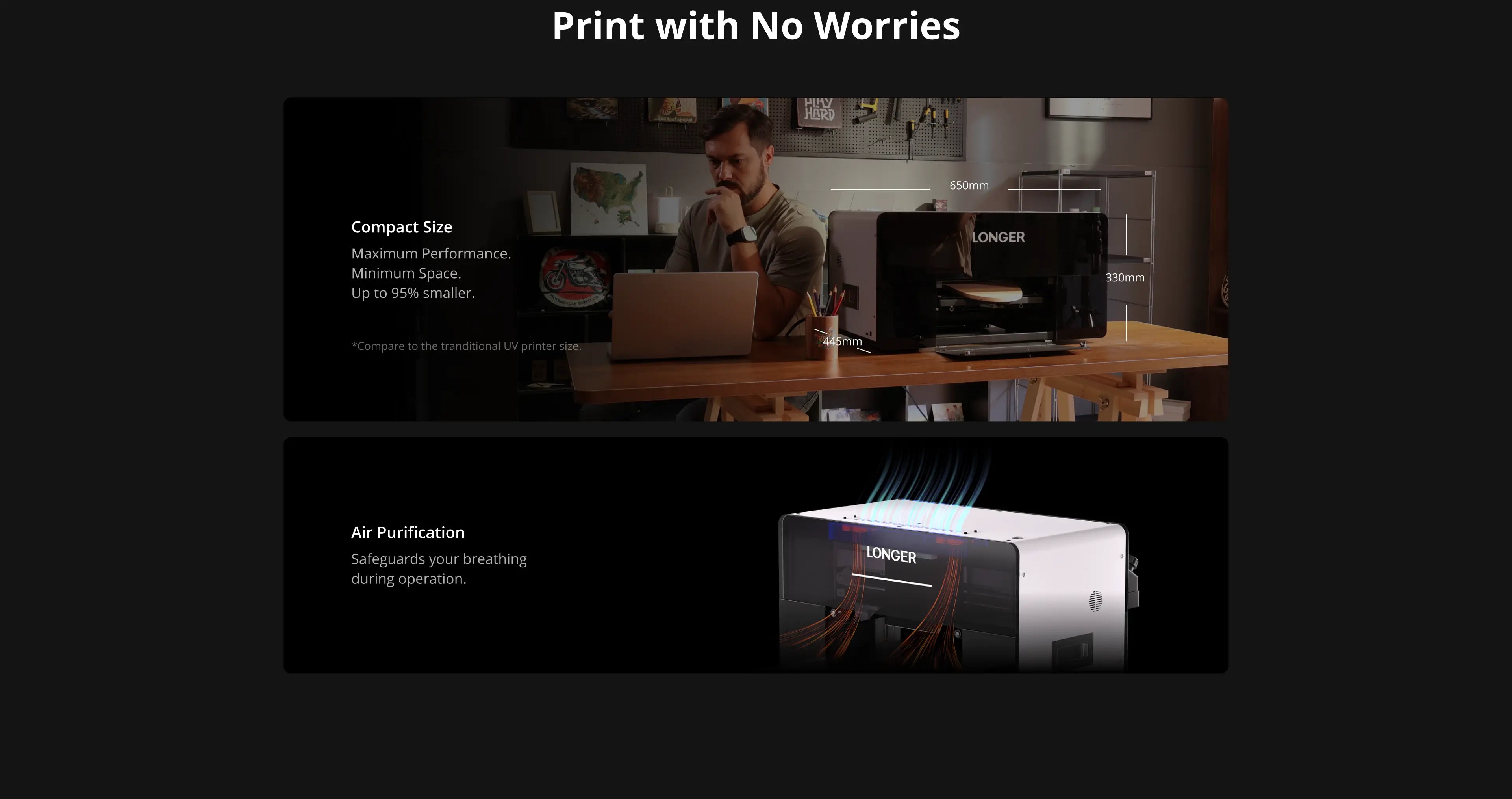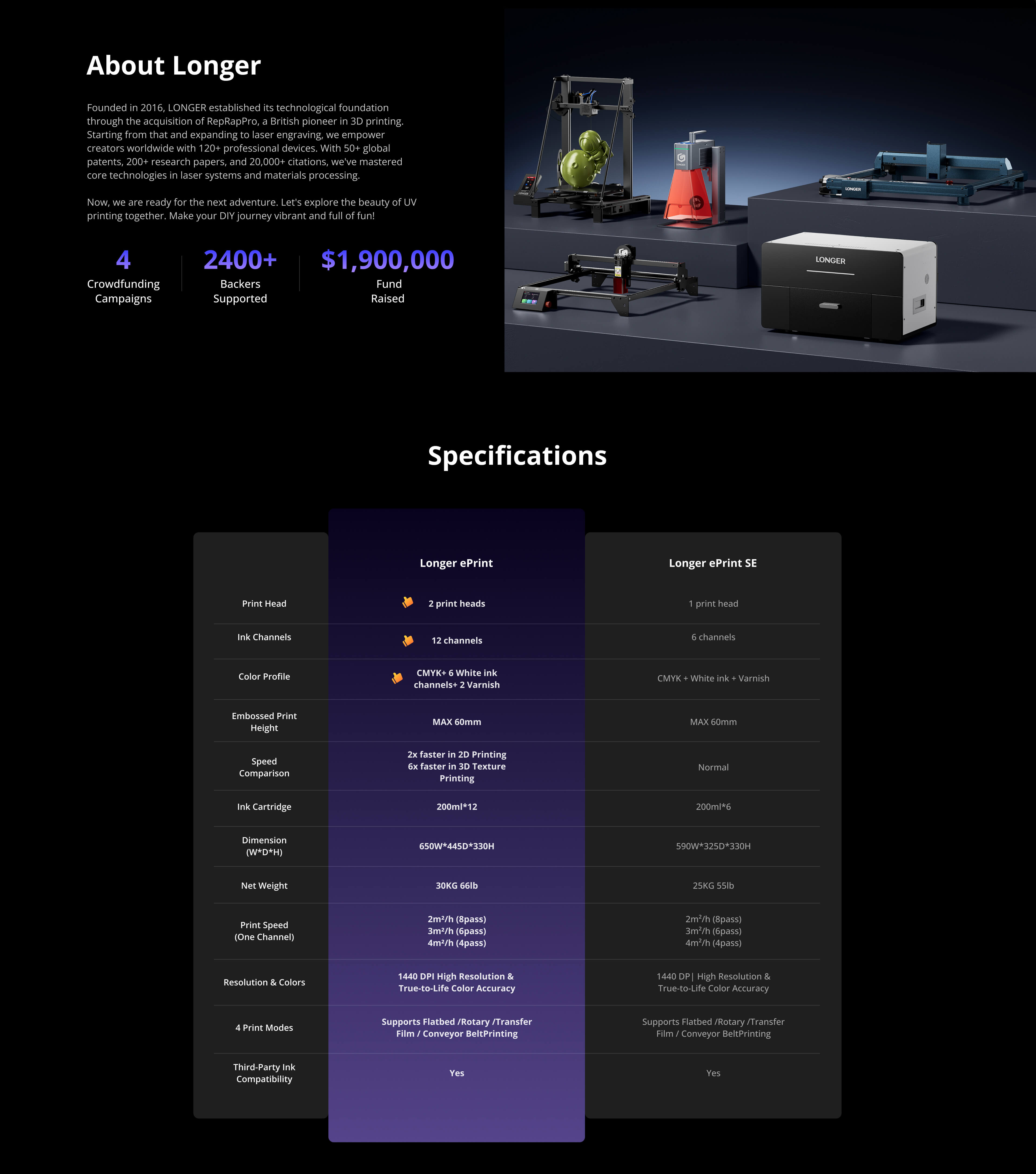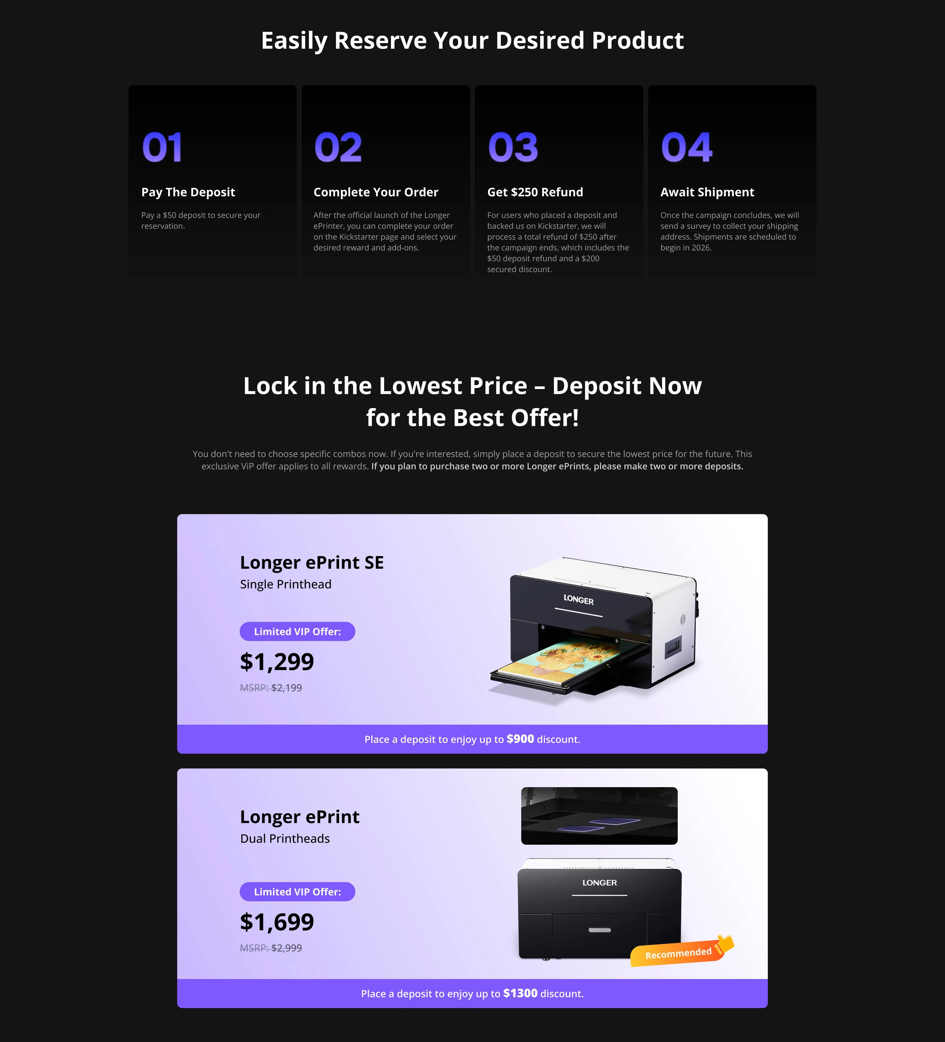 To show our appreciation for your early trust and support, we're offering an exclusive VIP Offer on the Longer ePrint UV printer for our first-wave supporters. By placing a $50 deposit, you can lock in the VIP price of the ePrint SE ($1,299) or the ePrint ($1,699), saving you $900 or $1,300 off the retail price! The deposit is also 100% refundable if you change your mind before the official launch.