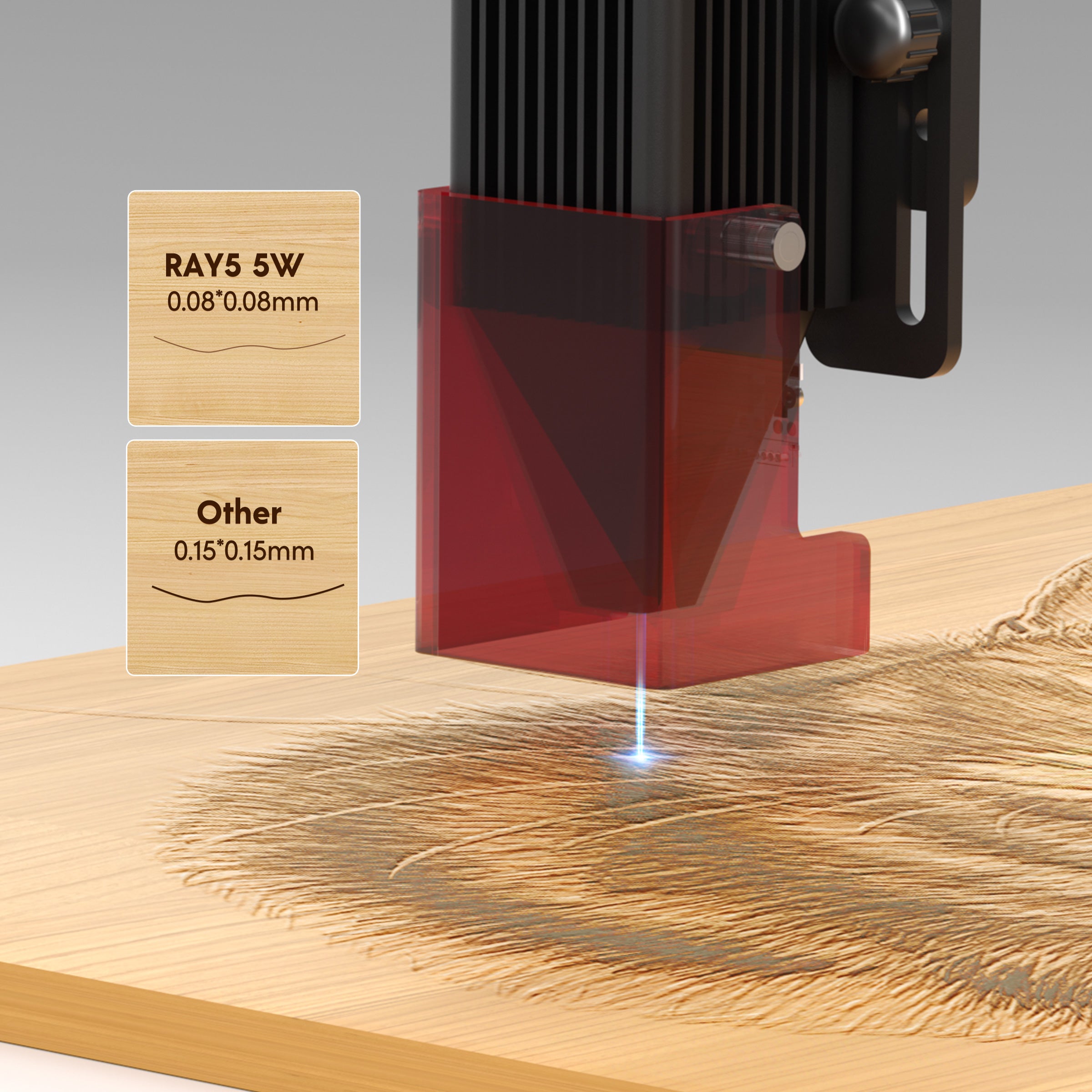 Ray5 5W laser engraver has a strong 5.5W output power and adopts the latest laser FAC compressed technology, the laser spot size is 0.08*0.08mm, which makes engraving or cutting more strong and precise. The engraving speed can reach up to 10000 mm/min