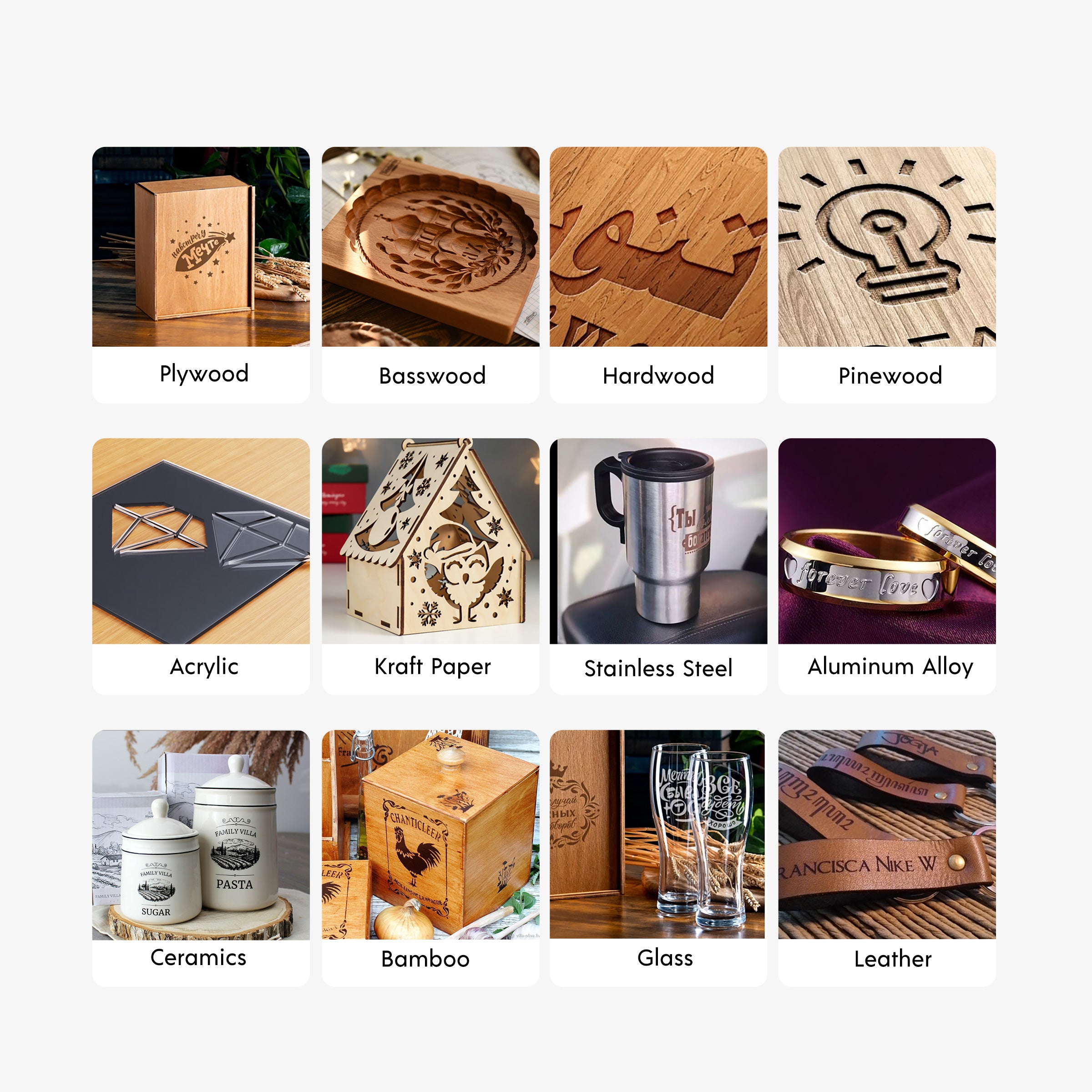 Supported engraving materials: all wood, paper, plastic, leather, PCB board, aluminum oxide, non-reflective coating and painted metal, etc