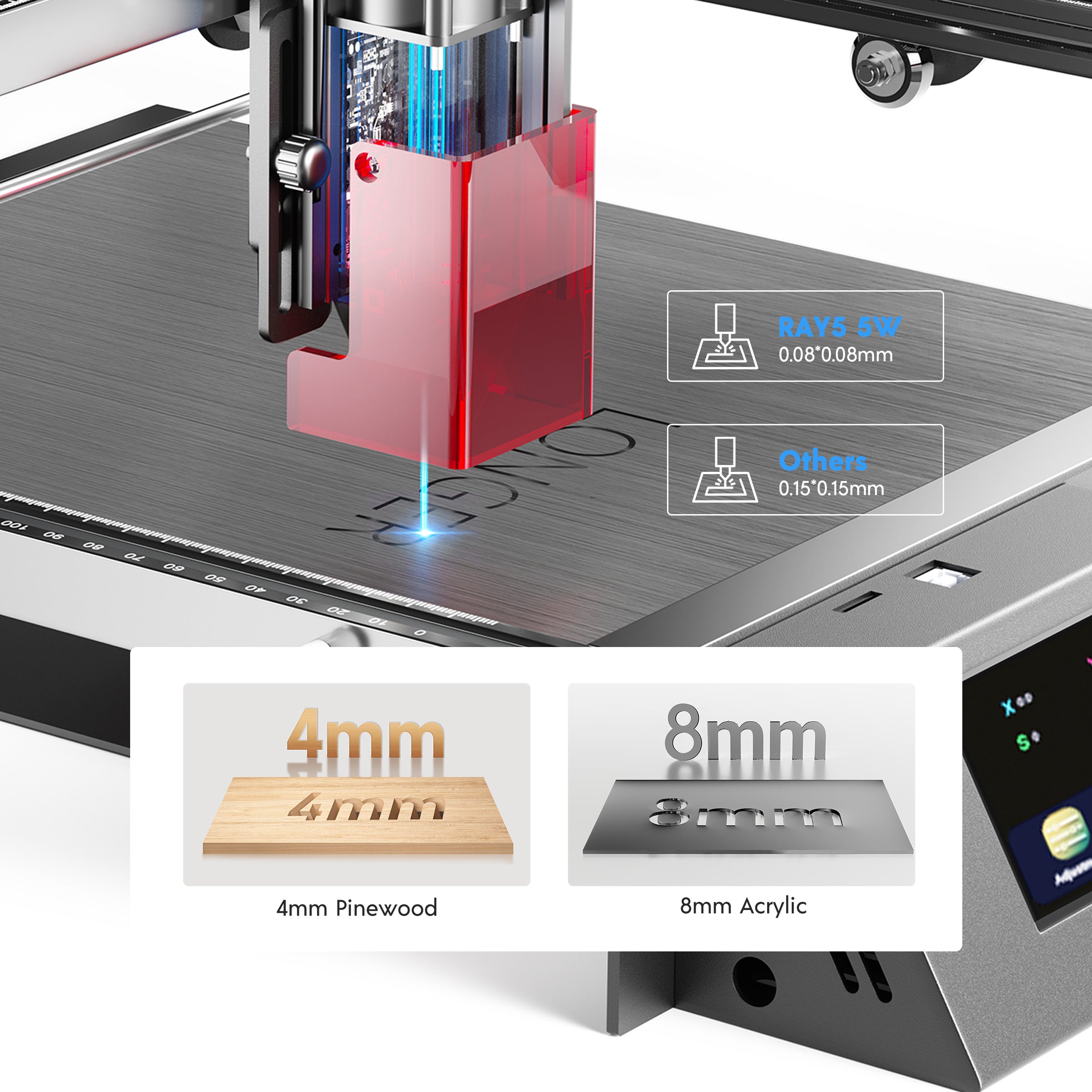 RAY5 10W maximum cutting capacity is 20mm Basswood and 30mm Acrylic
