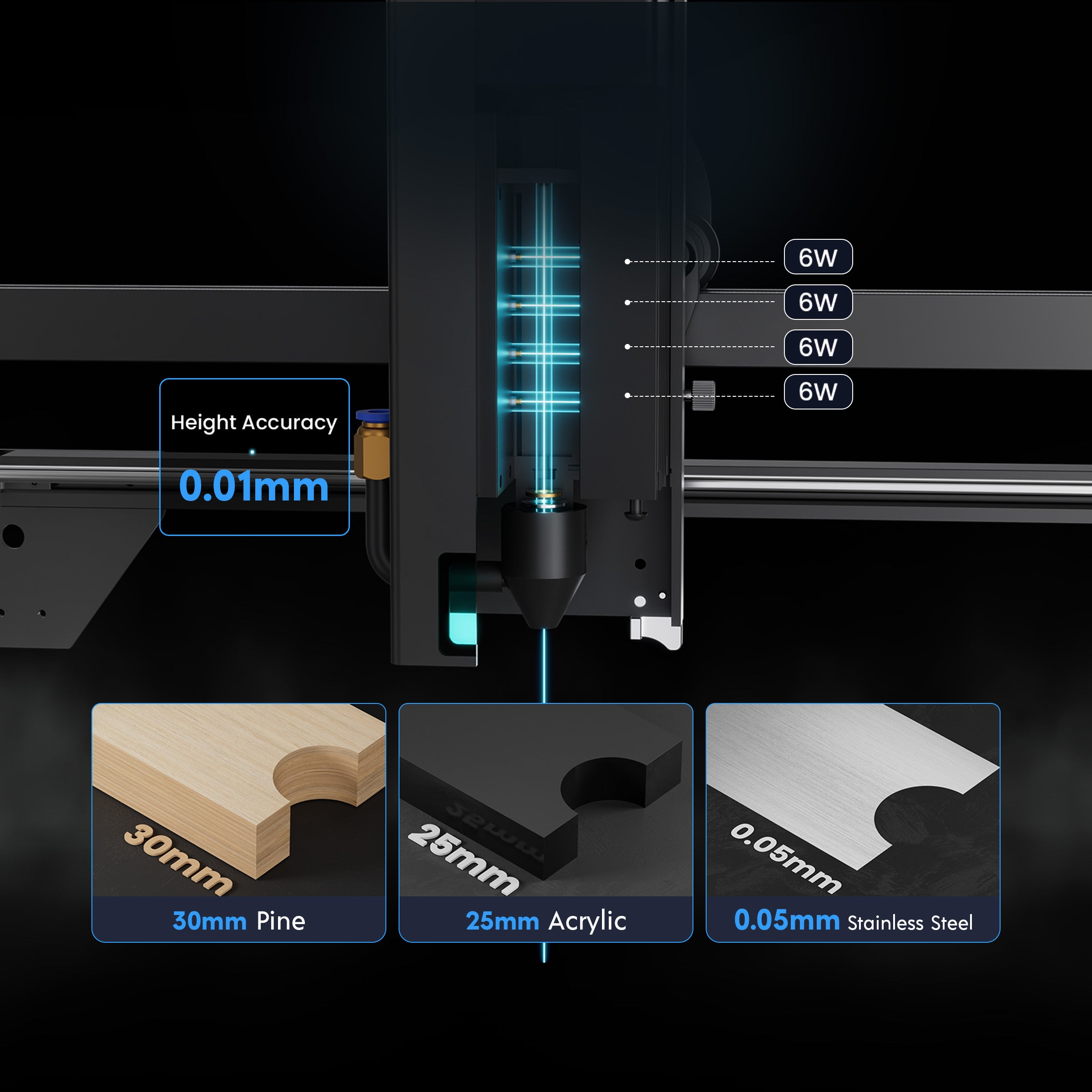 RAY5 20W maximum cutting capacity is 25mm Pine wood and 35mm Acrylic, 0.05mm stainless steel
