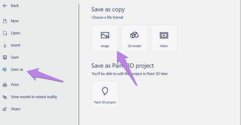 Once the 3D model has been imported into Paint 3D, select "Menu – Save as – Image".