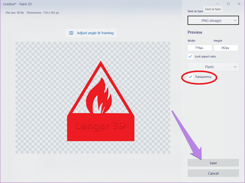Finally, enable the flag on "Transparency" (absolutely important!) and proceed to save the image as .png file.