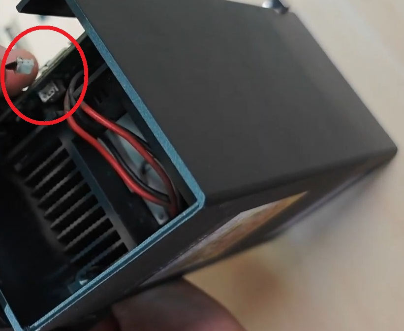 After removing the metal cover, gently lift the fan, then gently disconnect its connector from the rest of the laser module, as shown in the figure.