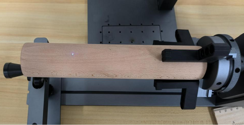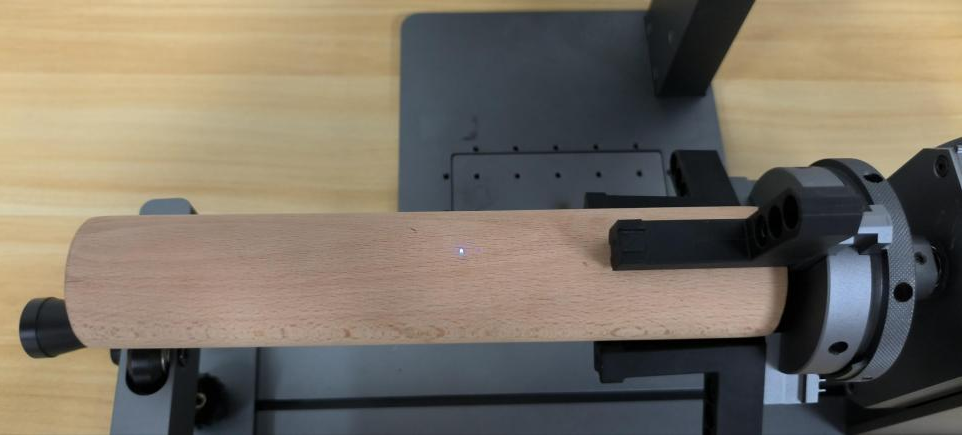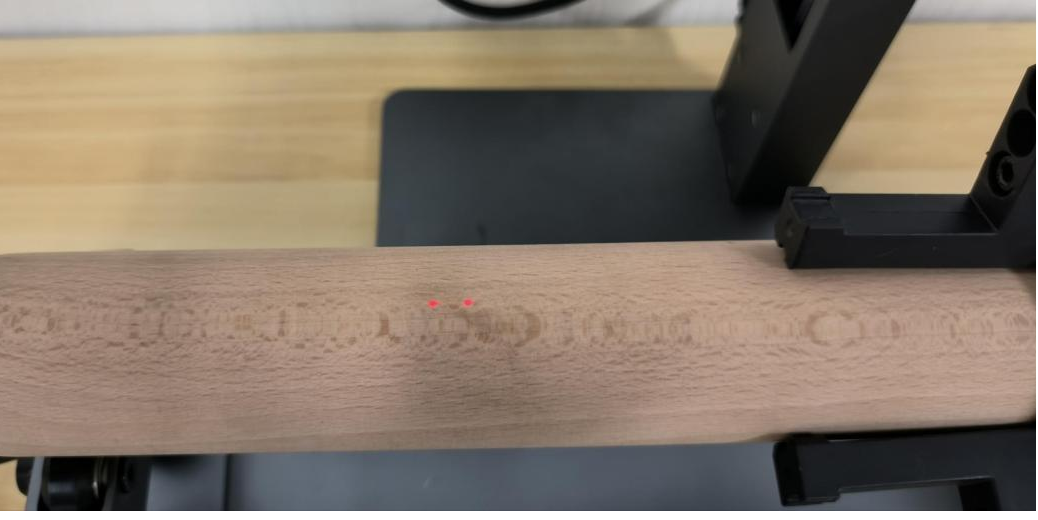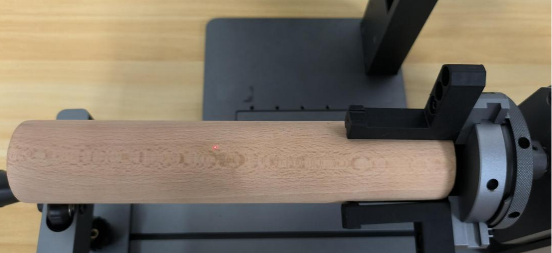 In the LightBurn software, click “Fire” and adjust the rotary clamp until the laser is precisely aligned with the top of the material.