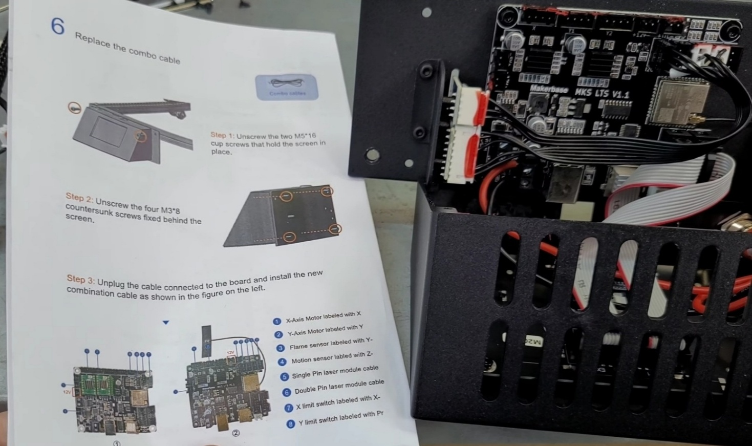 Referring to the manual included in the 30w kit, remove the connected cables and proceed to connect the new cables for the 30w laser module.