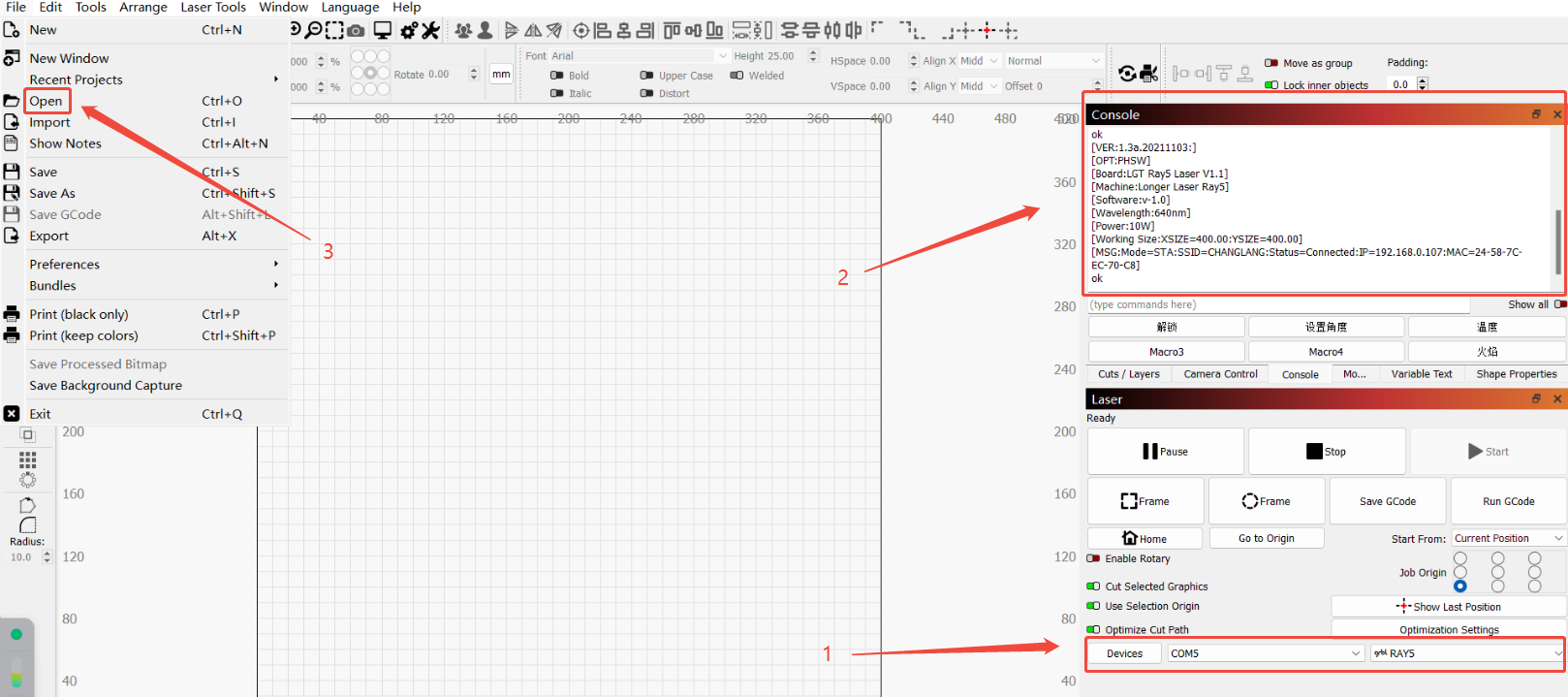 Open the LightBurn software and import your machine configuration. Make sure to select the correct communication port and load the configuration for the RAY5 machine. When the console displays “RAY5 Connected Successfully,” proceed to the next step.