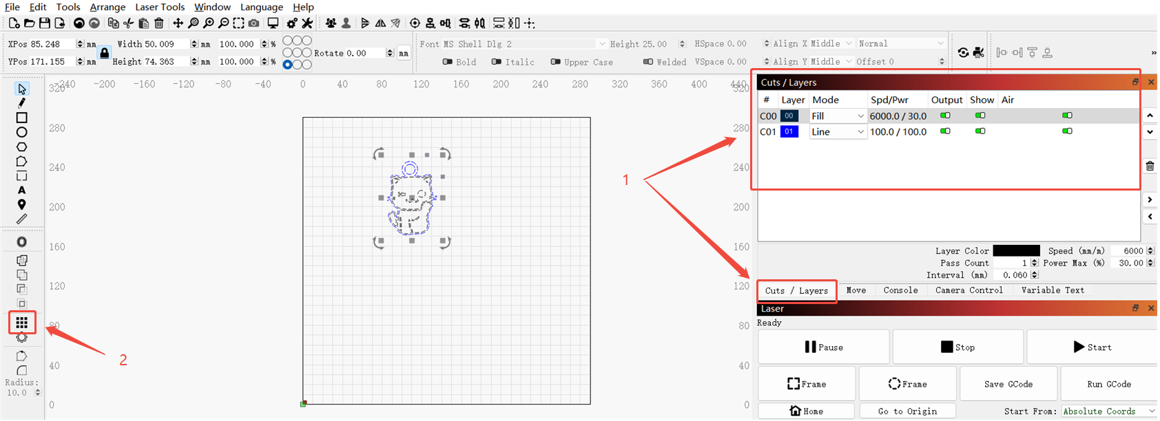 After importing the design, select the object you want to cut. Click on “Cuts” to set the appropriate power and speed values according to your material and project requirements.