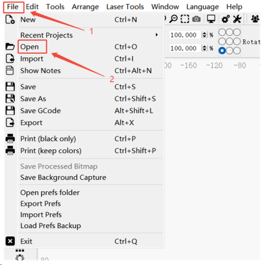Open the LightBurn software. From the “File” menu, select “Import” to bring in your design file. Make sure your design is displayed correctly on the canvas.