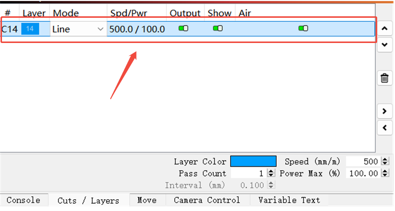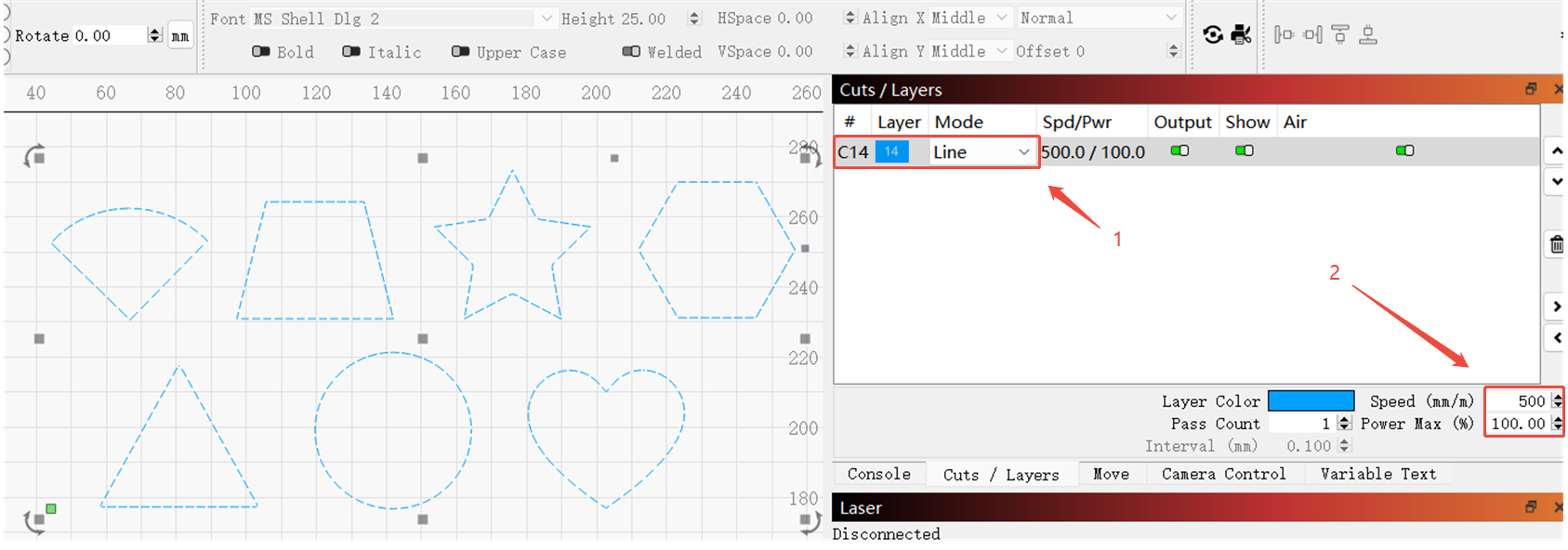 Make sure the cut mode is set to "Line", and adjust the speed and power settings as needed.