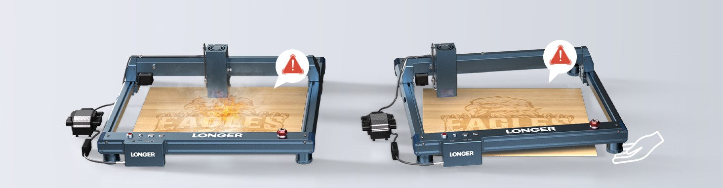 LONGER laser engraving machines come equipped with several safety features to ensure a secure operating environment. These include flame detection, movement detection, motionless protection, an emergency stop button, and eye protection. These safety measures help detect and respond to potential hazards such as fires, unexpected movements, unauthorized operation, and emergencies, ensuring the safety of both users and the equipment during laser engraving processes.