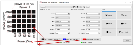 Choose which parameters to vary along the X and Y axes — options include Speed, Power, Interval, and Passes.