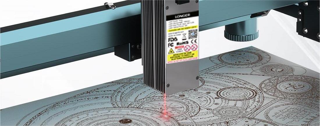 Blue light laser engraving machines use shorter wavelength blue light as the engraving light source, with higher resolution and smaller spot diameter. This makes it excellent at handling thin materials such as paper, plastic and metal films. Blue light laser engraving machines also have high engraving accuracy and low heat output, so they have advantages in fine engraving and high-precision cutting.Longer's LaserB1 series and Ray5 laser engraving machines represent prime examples of blue laser engraving technology, maintaining their blue laser functionality without the need for a laser head change.