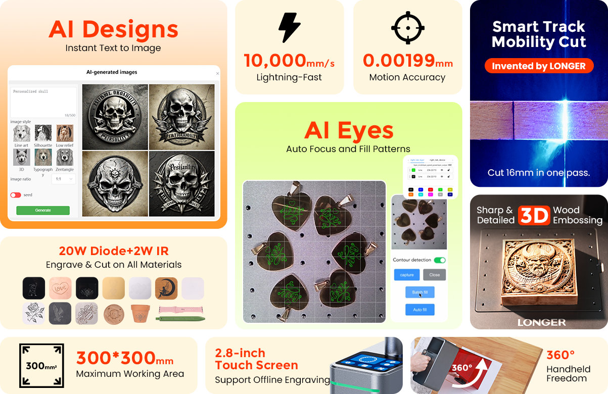 With LONGER Generative AI, you can easily create rich and diverse designs by simply typing a few words. The Nano Duo’s advanced positioning and sensing system ensures precise placement, while the intelligent 16MP AI eyes automatically focus, fill patterns, and provide an effect preview, saving you time and effort.