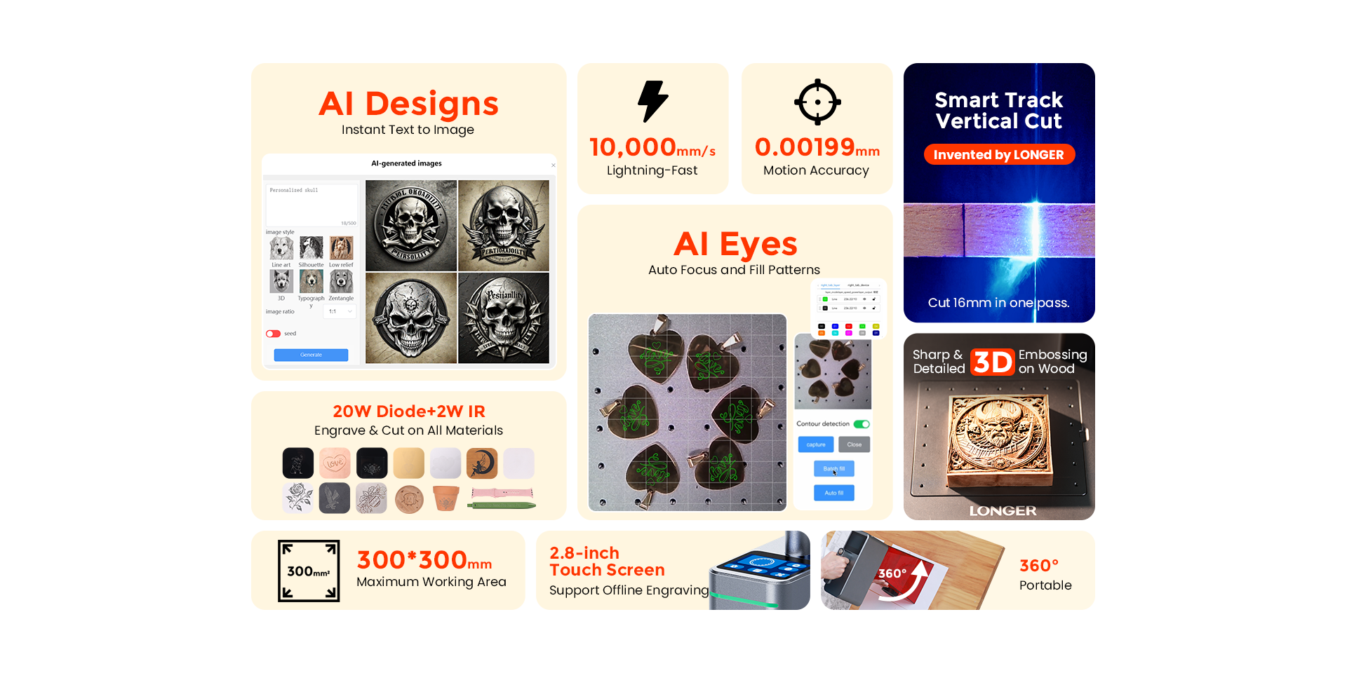LONGER pioneered the Smart Track Vertical Cut, this innovation preserves exceptional engraving detail and precision, while also enabling motion vertical cutting at any spots up to 16mm for greater versatility.