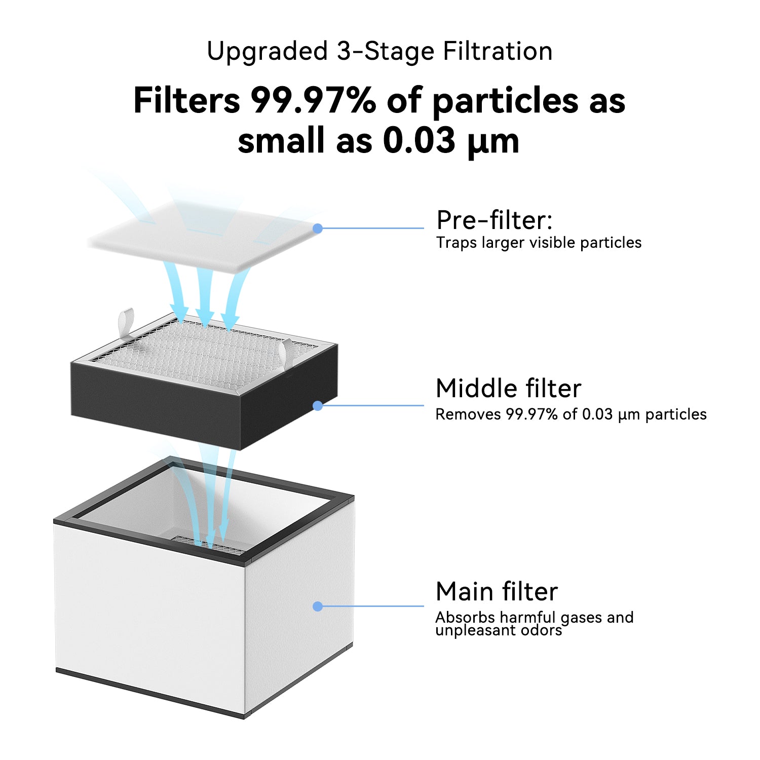 • Powerful Filtration: 3-layer system filters particles as small as 0.3μm, achieving a 99.97% purification rate.